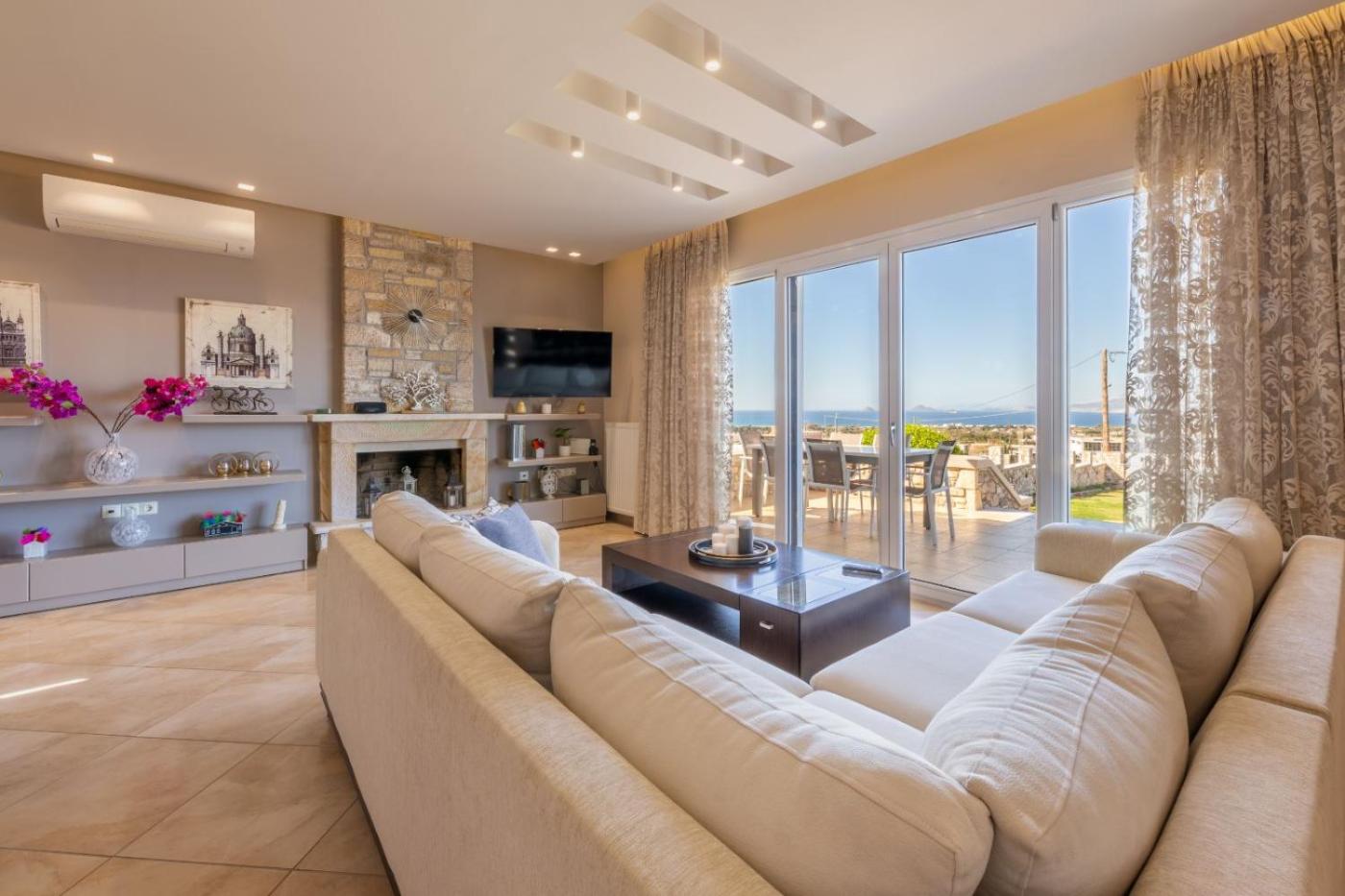The villa is fitted with 3 bedrooms, 2 bathrooms, bed linen, towels, a flat-screen TV, a dining area, a fully equipped kitchen, and a terrace with sea views. Guests can take in the ambience of the surroundings from an outdoor dining area or keep themselves warm by the fireplace on colder days. Additional in-room amenities include wine or champagne.